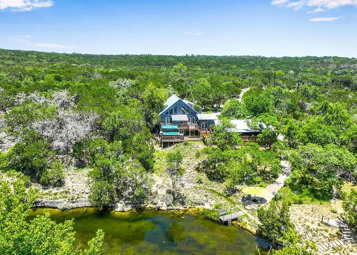 Welcome to Creekside Vista Escape - All, where comfort meets the tranquility of nature. Nestled in the enchanting landscape of Wimberley, this exquisite retreat offers a perfect getaway just 60 km from Austin-Bergstrom International Airport. Surrounded by lush greenery and serene waters, guests are invited to experience a harmonious blend of luxurious amenities and the charm of the Texas hill country.